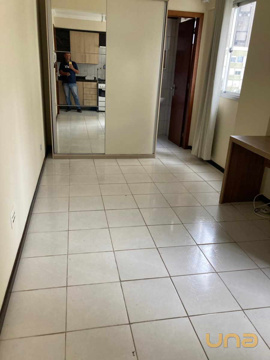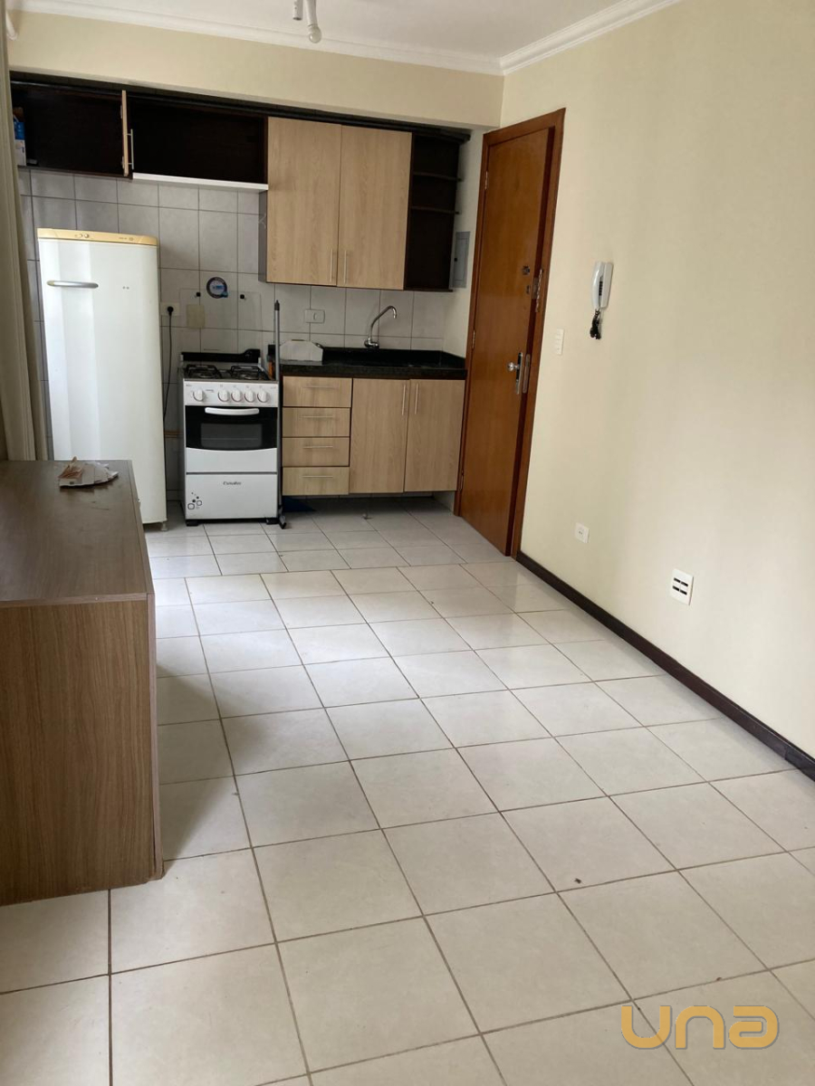 Esse apartamento compacto dispõe de cozinha com armários, fogão, geladeira, guarda-roupa, cortinas, banheiro com box.