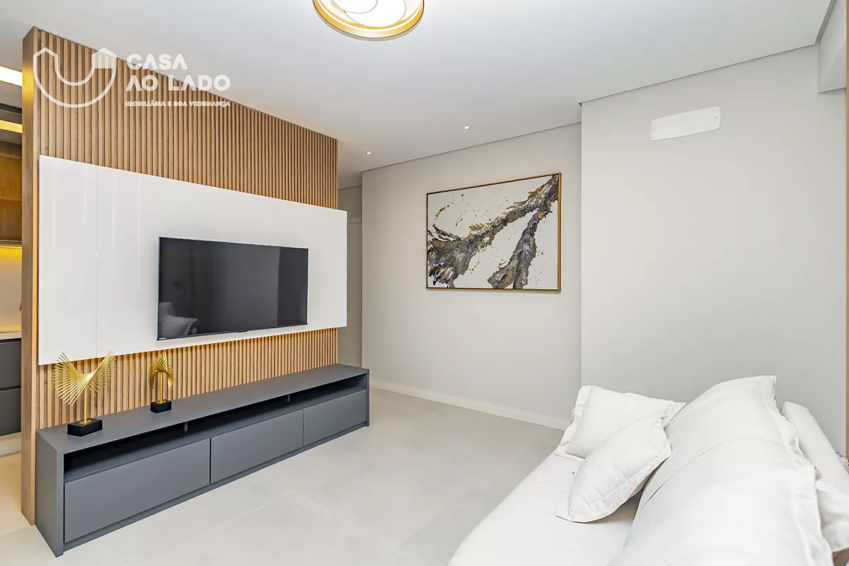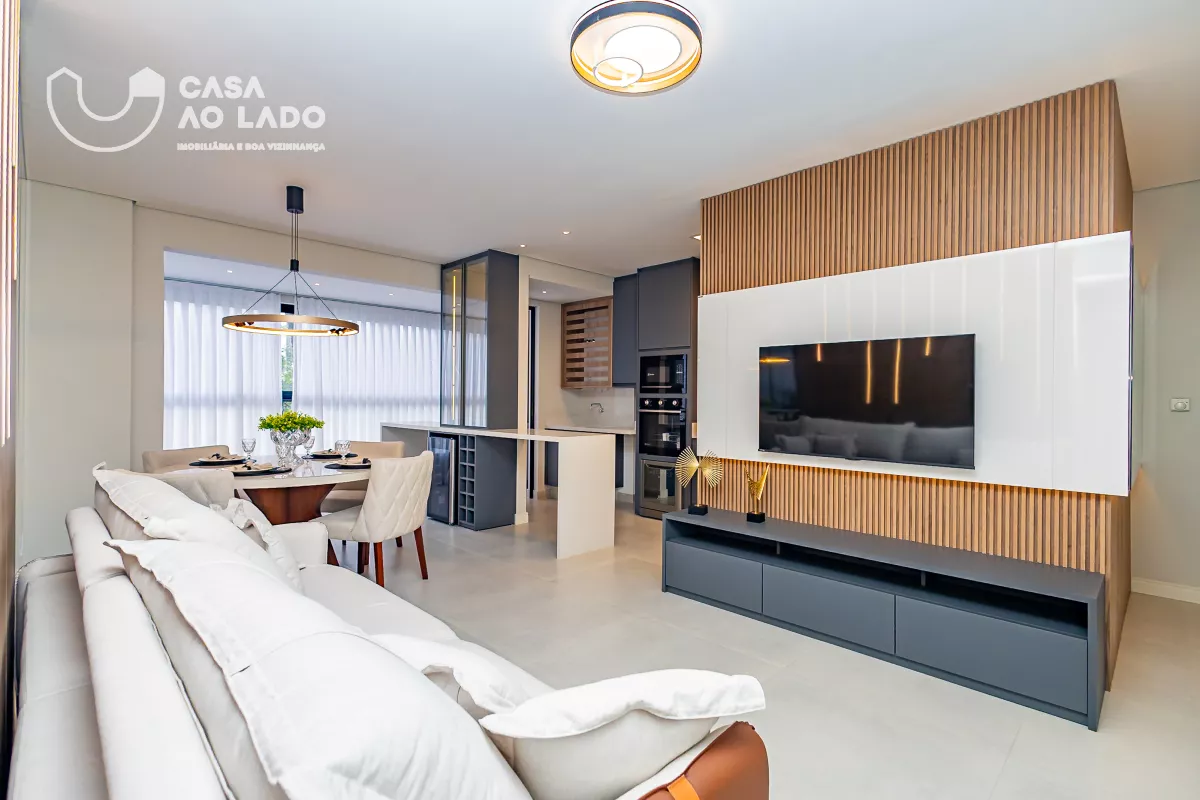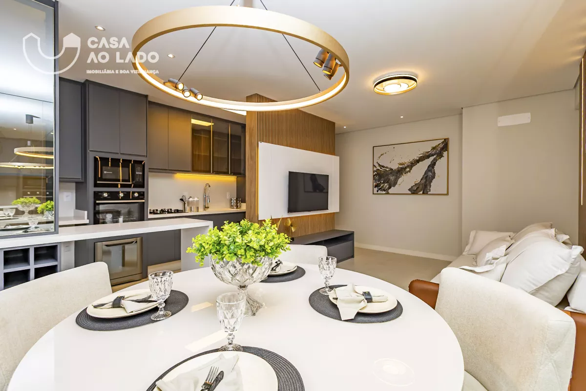 Ambientes Sociais e de Serviço: Sala de estar com sofá, hack e painel com tv, sala de jantar com mesa de 6 lugares, cozinha com armários planejados, cooktop e forno, sacada com churrasqueira á carvão, área de serviço e lavabo com louças já instaladas.
