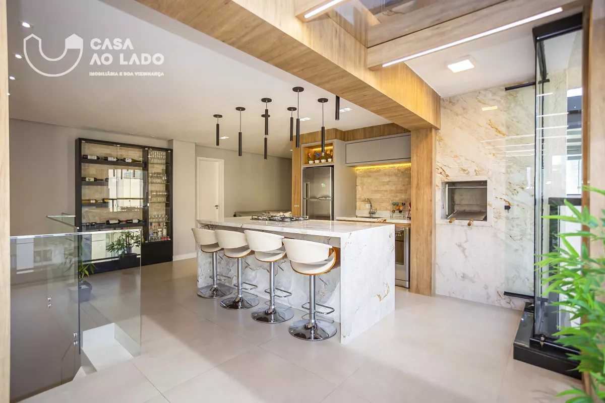 A área gourmet é um dos grandes destaques, equipada com cozinha com churrasqueira a carvão, ilha com cooktop a gás e espaço de refeição para até 4 pessoas. Conta ainda com uma sala de estar com rack e cristaleira, além de uma sala de jantar com lareira. O andar também oferece um banheiro completo, área de lavanderia separada com máquina lava e seca, armários e ótimo espaço de armazenamento. O fechamento em Reiki permite integrar os ambientes internos com a vista externa, tornando o espaço ainda mais aconchegante e versátil.