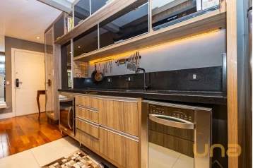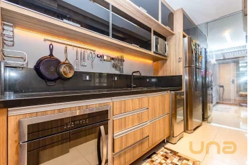 Cozinha equipada com geladeira, cooktop, forno, coifa e filtro de água;