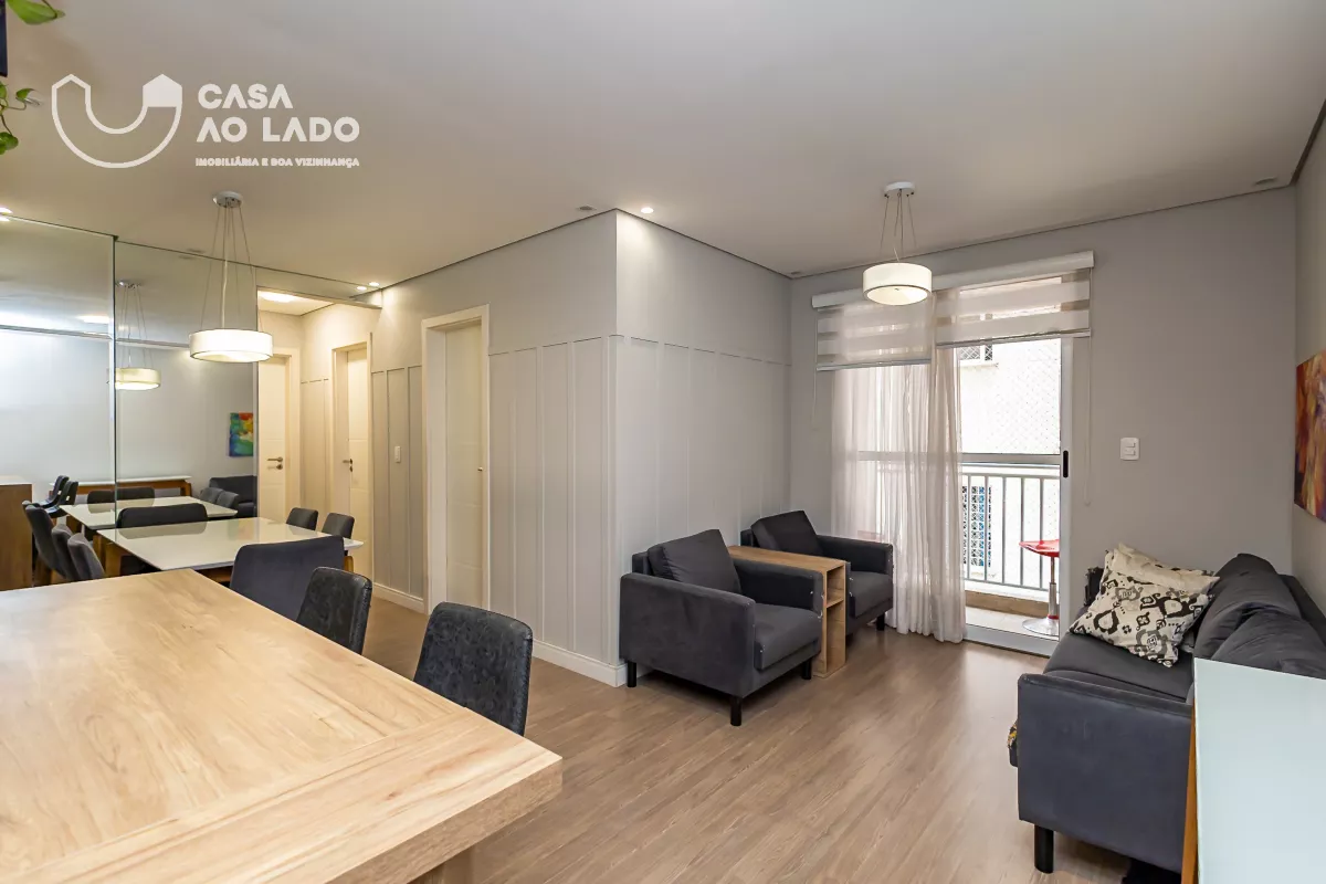 A sala de estar e jantar é ampla, bem iluminada e convidativa. A sacada com churrasqueira é um diferencial especial. A cozinha é totalmente equipada e decorada com excelente marcenaria planejada, unindo funcionalidade e estilo. O imóvel conta ainda com 1 banheiro social e área de serviço bem organizada.