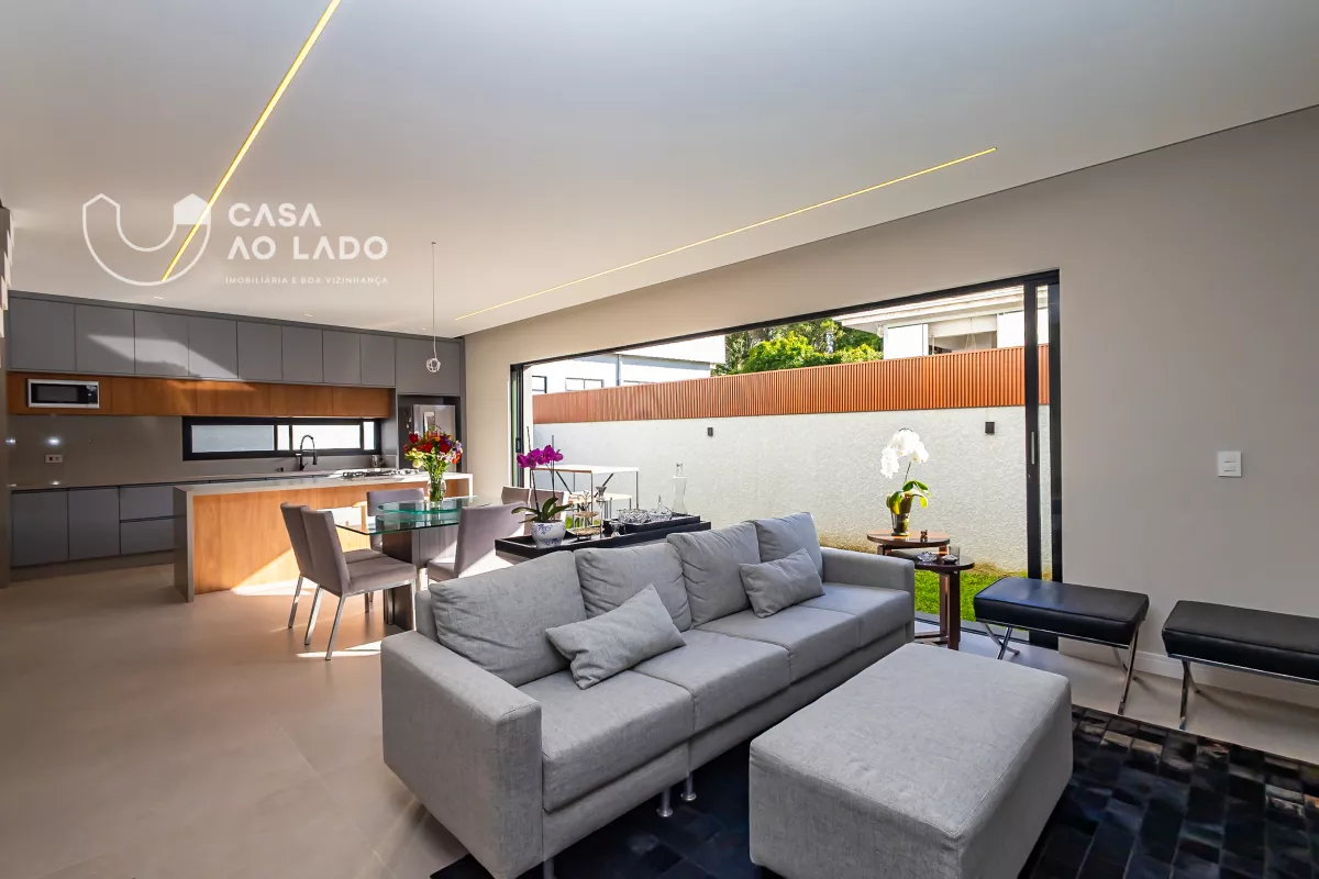 Esta é daquelas casas que conquistam logo de cara. Os ambientes sociais totalmente integrados criam uma atmosfera muito acolhedora, perfeita para viver o dia a dia com leveza e receber bem. Sala de estar, jantar e cozinha gourmet se unem em um único espaço, que ganha ainda mais vida quando a porta de vão livre de mais de 6m se recolhe atrás do drywall, conectando tudo ao jardim como se fosse uma grande varanda aberta. Um detalhe que transforma a experiência da casa.