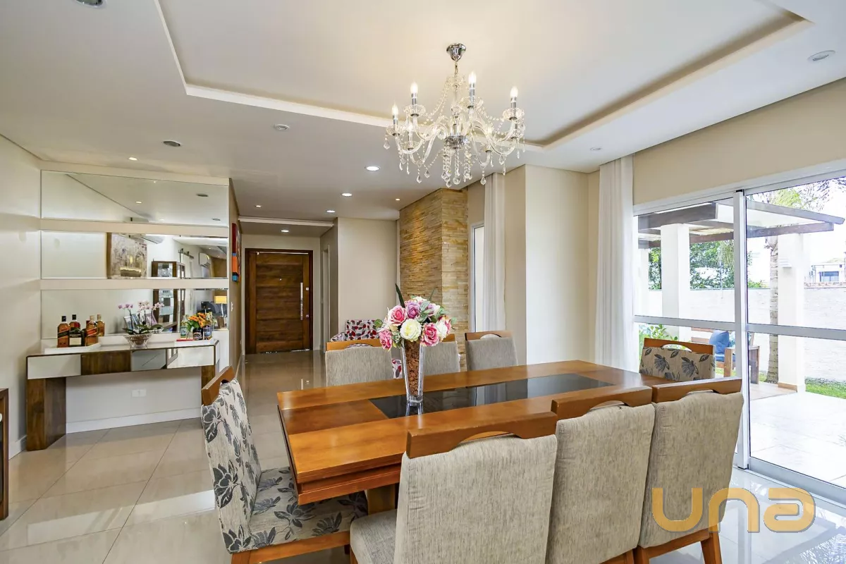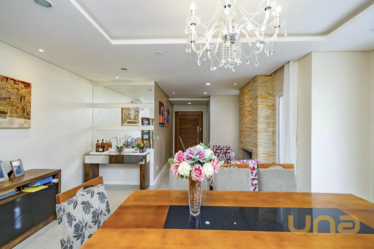 São 4 quartos, sendo 1 suíte com um closet super espaçoso e ventilado e o banheiro com hidromassagem e pia com 2 cubas, banheiro social, cozinha já com armários planejados e ao lado uma despensa. A sala dividida em 2 ambientes possui ar condicionado e o hall de entrada com lareira, ambiente perfeito para tomar um vinho e aproveitar dentro de sua casa com conforto o inverno de Curitiba. O espaço gourmet com churrasqueira é integrado ao jardim da casa com o qual conta com um espaço bem generoso com pergolado e espaço para instalação de uma piscina.