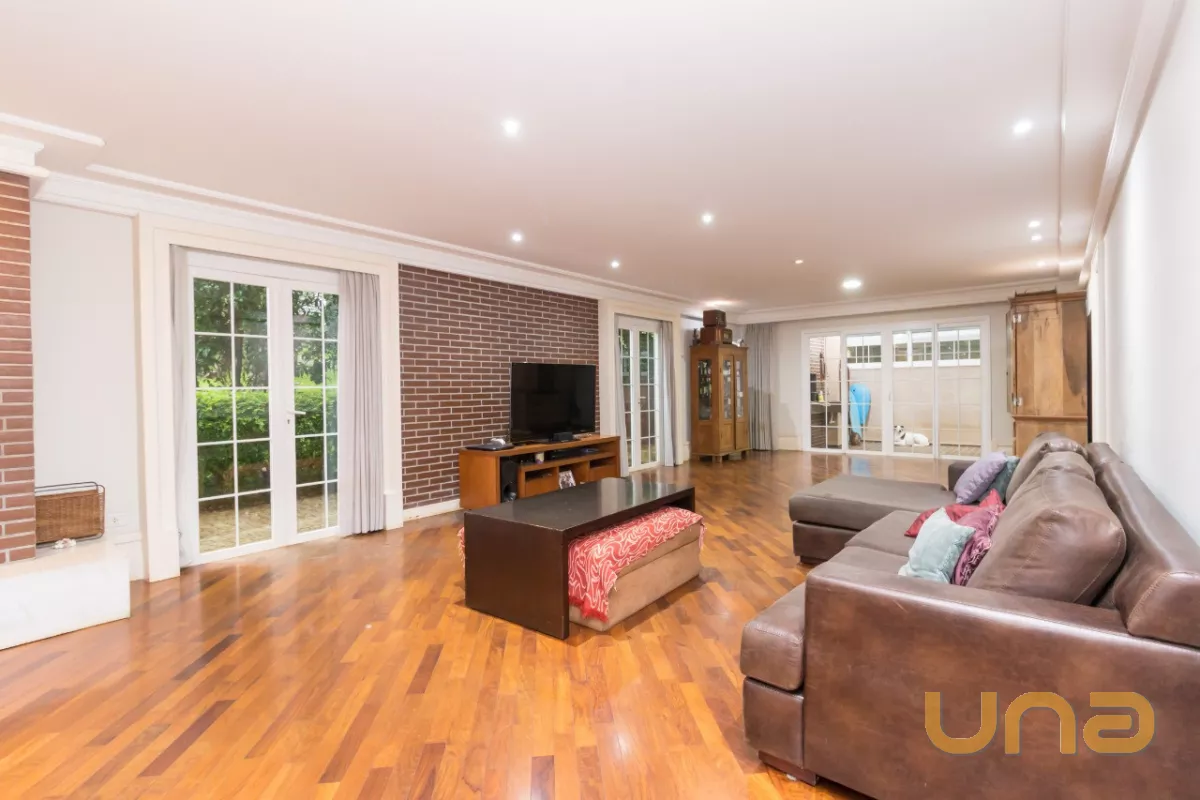 Residência em dois pavimentos no Condomínio Chácara Shangai em terreno com 764m2 privativos, peças amplas, janelas em pvc, boa sobra de terreno nos fundos. Pavimento térreo conta com ampla sala em 2 ambientes, escritório, lavabo, sala de estar com lareira integrada a churrasqueira coberta, cozinha com armários planejados, dispensa, lavanderia. Pavimento superior conta com 4 suítes com armários e varanda e 1 suíte master com closet e hidro. Condomínio conta com quadra de esportes, salão de festas, sauna e playground