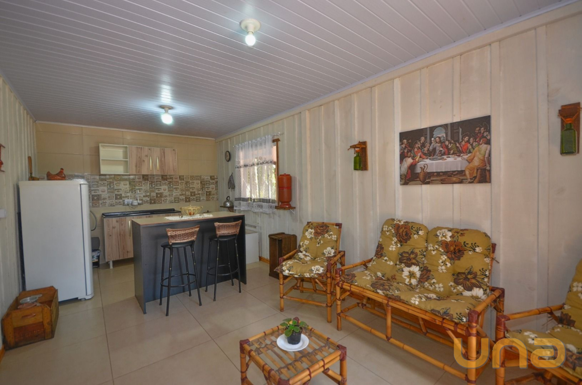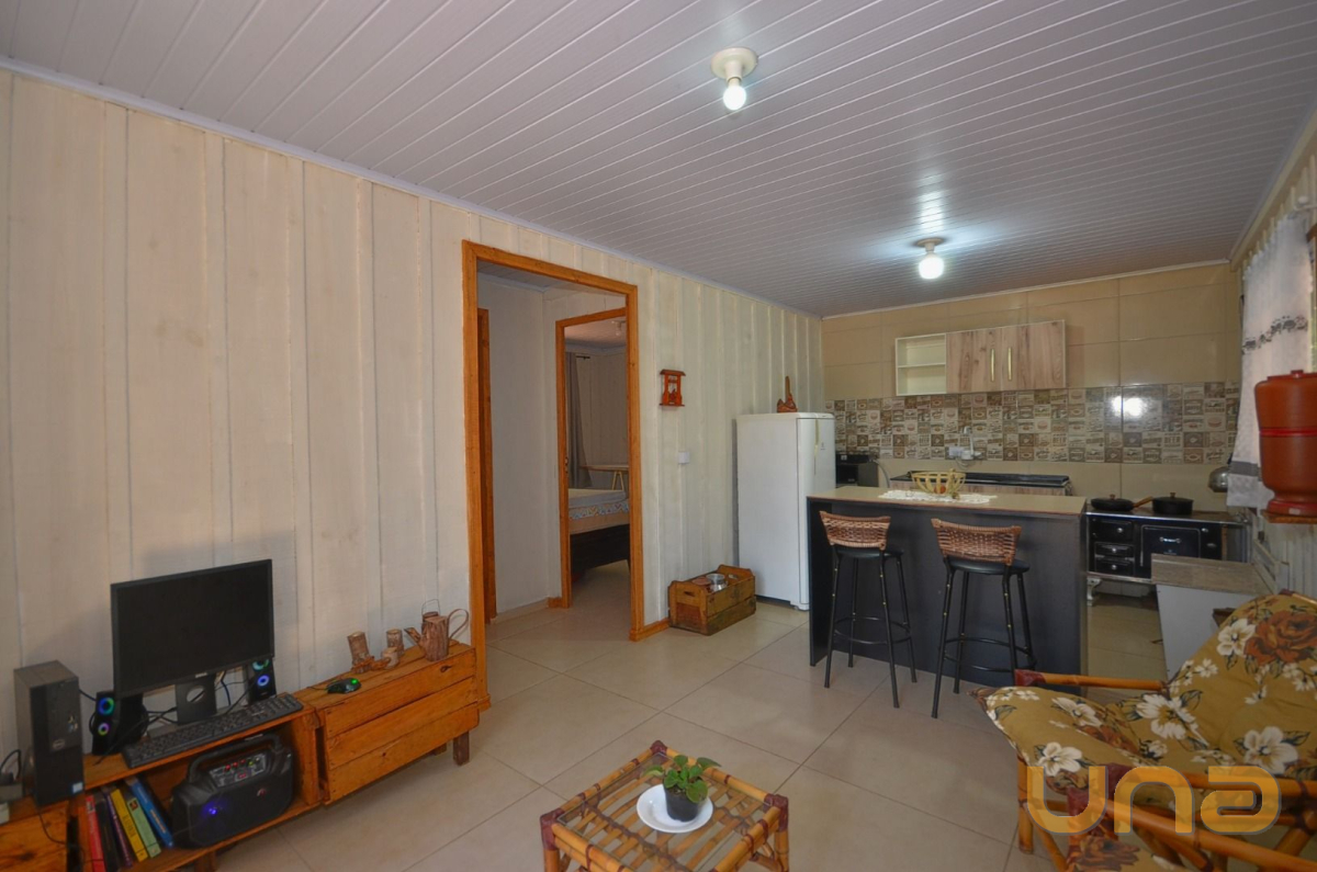 - Cozinha com armários, geladeira, fogão à lenha, pia com armário, mesa para pequenas refeições com 2 banquetas;