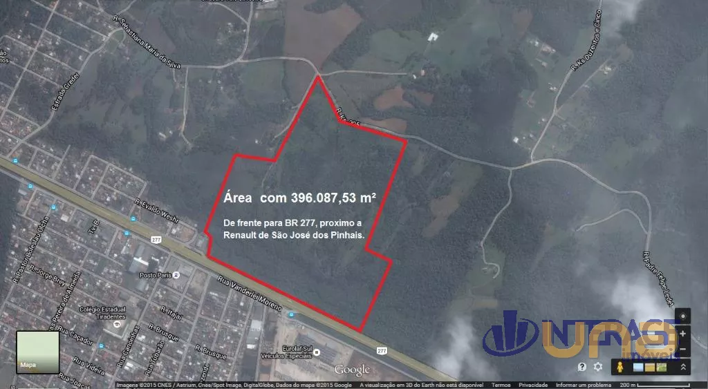 Belíssima área de 396.087,53 m² em Piraquara/PR divisa com São Jose dos Pinhais/PR, documentação em dia, ótima localização, de frente para a BR-277 próximo a Renault do Brasil de São José dos Pinhais/PR, ideal para investidores e incorporadoras, com projeto de viabilidade pronto dentro dos parâmetros exigidos, contendo 88 lotes com média de 2.000,00m² privativos cada.